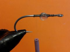 - Put a drop of super glue in the split of the bead or on the base of cotton thread and carefully position the bead half way between the back of the eye of the hook and that point on the hook shank directly above the tip of the point of the hook.