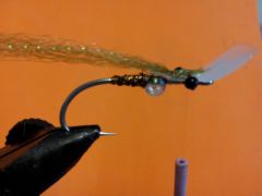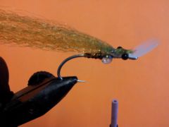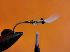 - Tie in the Super Hair in on top of the fly in the gap between the bead and the monofilament or plastic bead chain eyes.