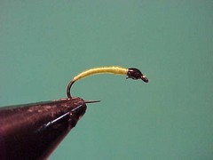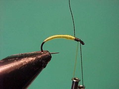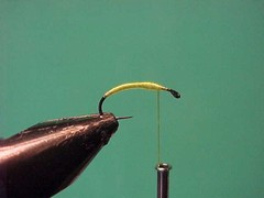 | Size 14 to 16 curved nymph or caddis | Yellow or lime floss | Thread | Dark olive or brown thread |