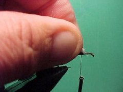 - Do a couple of tight wraps of thread to ensure that the hairs are secured into position on top of the hook shank. If you have done this step correctly you should be able to apply some downward pressure on the bobbin without the hair rotating round the hook shank.