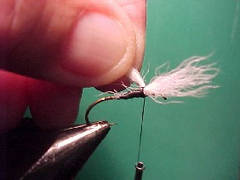 - Use the fingers of your left hand to stand the wing hair upright and take a few wraps of thread directly in front of the wings to maintain that stance.