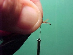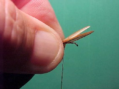 3. Use the fingers of your left hand to stand the wing slips upright and take a few wraps of thread directly in front of the wings to maintain that stance.