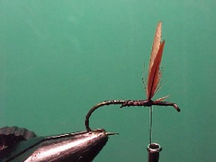 Feather tips for use as wings for a dry fly are most often taken from hackles but other feathers such as hen, blackbird, pigeon etc. are also used. Feather tip wings tied from fowl tips are generally thin and delicate but tips from other types of feathers can be a little more robust. In either case feather tip wings should be symmetrically positioned above the hook with the wings separated by an angle of between 70 degrees and 90 degrees. As for other dry fly upright wings they should be at least as long as the hackle and up to 150% of the hackle length.
