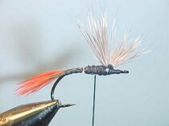 - Tie in the hackle feather and wind it 2 or 3 times behind the wing and 2 or 3 times in front of the wing and tie the hackle off.