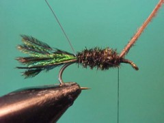 - Tie in several strands of peacock herl in along the top of the hook shank. I have tied in 4 strands for this size #10 fly